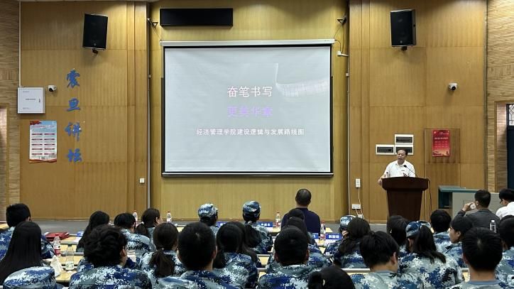 於世为院长代表学院热烈欢迎2025级新生,祝贺大家圆满完成军训。他简要回顾了学院四十年发展历程,阐述了“宽信敏公、经国济民”的院训内涵,并寄语新生胸怀家国、思行合一、修身立德,努力成长为有深度、有锐度、有温度的经管人才。於院长还以杰出院友为例,勉励同学们以优秀前辈为榜样,珍惜时光、奋发成才,努力成长为服务国家与社会发展的栋梁之才。